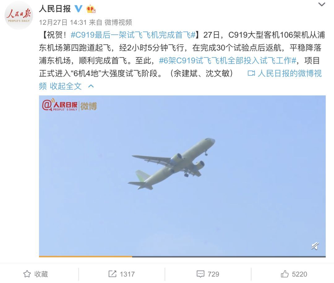 27日中午,另一个“胖子”C919也来凑热闹,C919最后一架试飞飞机完成首飞!