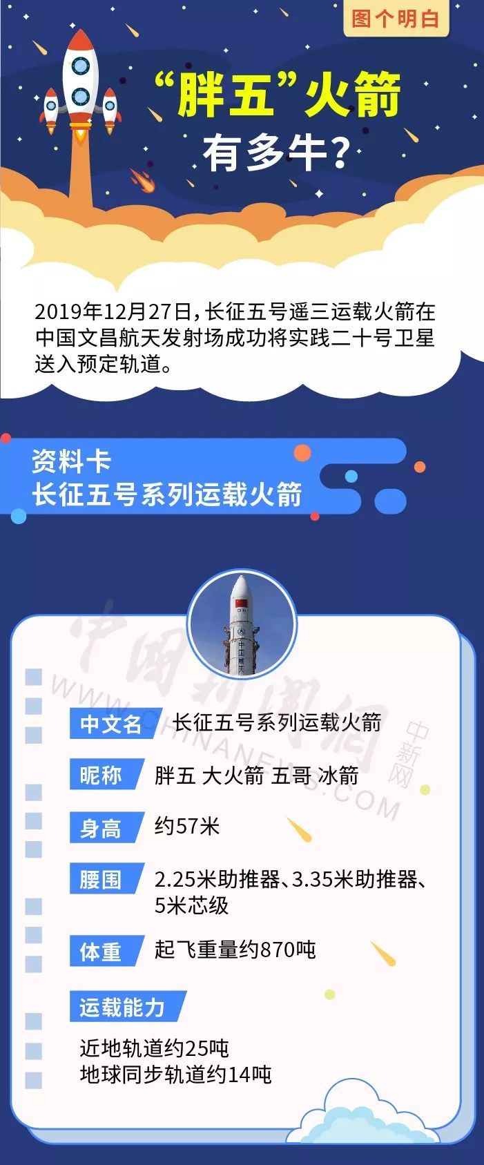作为中国首型5米芯级直径的大推力运载火箭,长征五号运载火箭长约57米,起飞时体重约870吨,由于体型宽大,被亲切地称呼为“胖五”火箭。