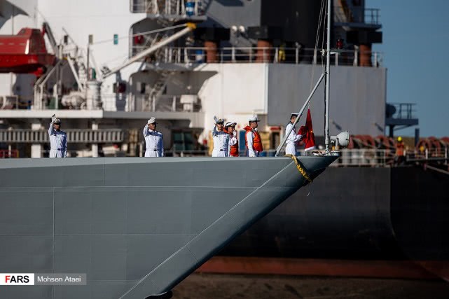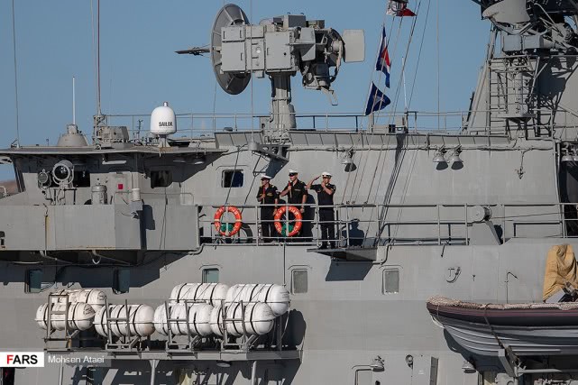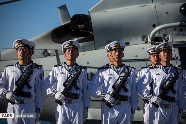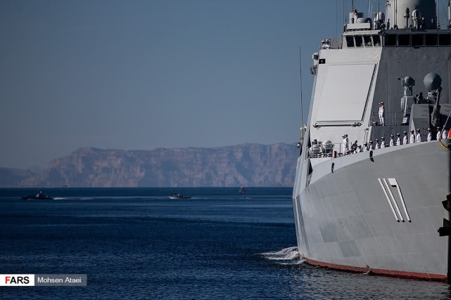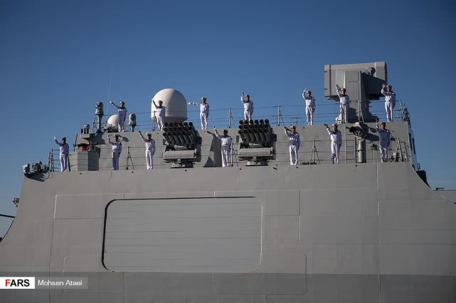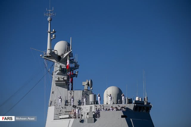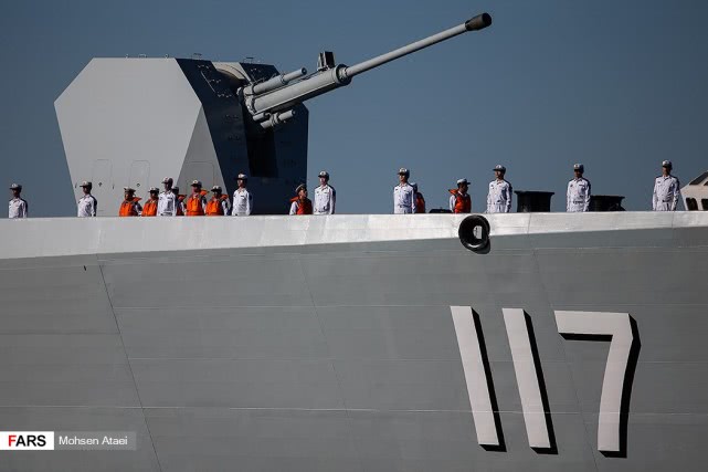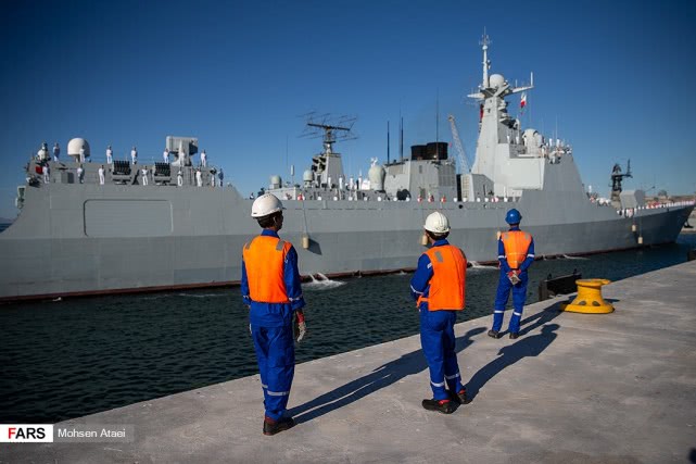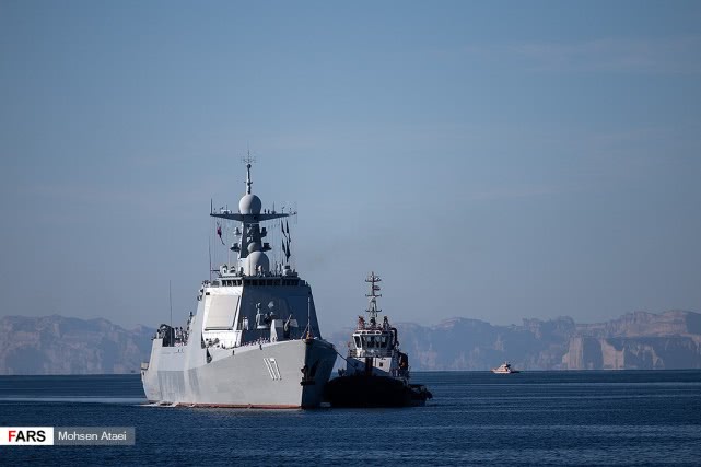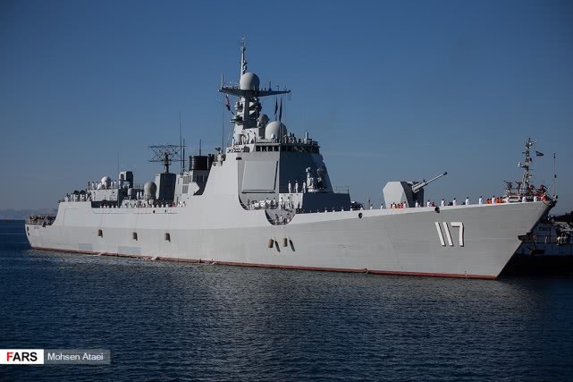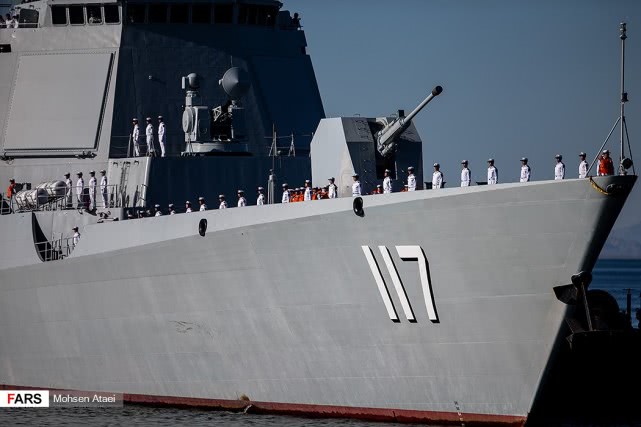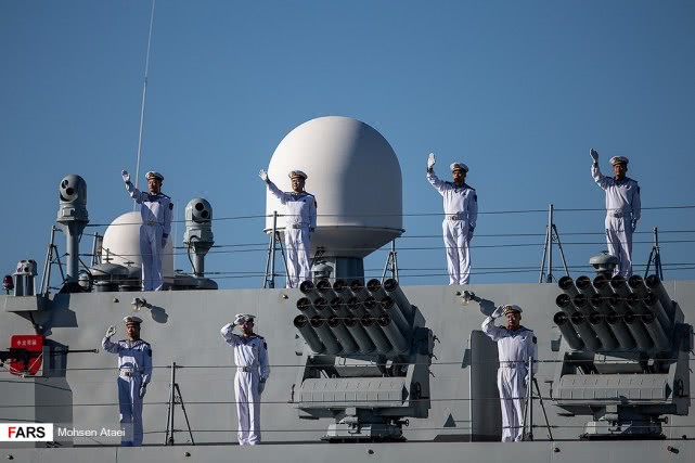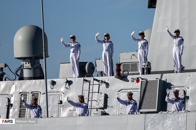 日前,伊朗法尔斯通讯社发布一组赴伊朗参加中俄伊海上联合演习的解放军海军052D型导弹驱逐舰西宁舰抵达伊朗恰巴哈尔港并受到伊朗海军热烈欢迎的图片,在西宁舰进入恰巴哈尔港时,舰上官兵整齐列队站坡致敬。