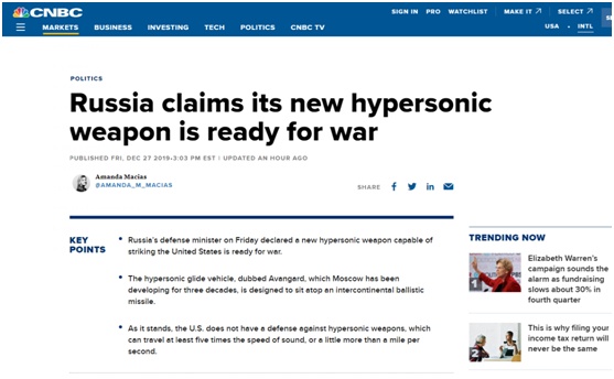 CNBC提到,俄罗斯这一新的高超音速武器能够打击美国,并且就目前情况而言,美国没有防御高超音速武器的能力。结合其速度、机动性和远程性等特征,这些高超音速武器难以被追踪、瞄准乃至击溃。该媒体称,尽管五角大楼有几个高超音速武器计划正在开发之中,但美防长埃斯珀今年8月曾表示,美国部署此类型武器还需要“几年”。