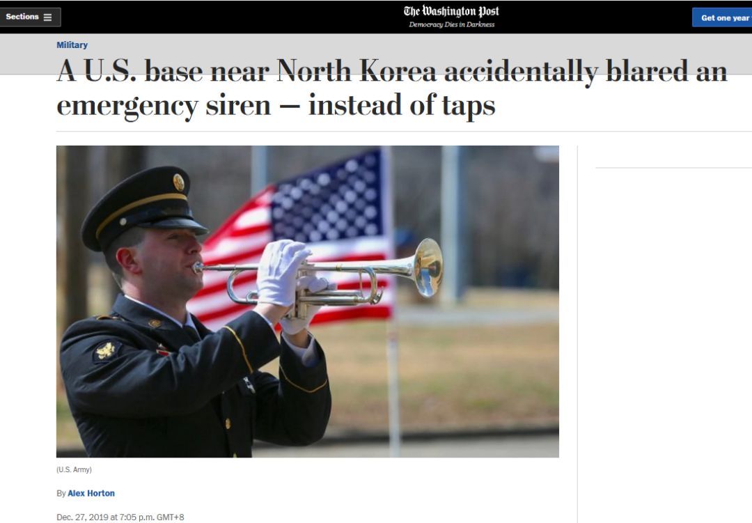 《华盛顿邮报》援引陆军发言人马丁·克莱顿中校(Martyn Cright Ton)的话称,按照陆军惯例,当天晚上十点左右,凯西营地的大喇叭本该播放号手在军事葬礼上演奏的忧郁歌曲“塔普斯”(Taps),(Taps是一首24音符歌曲,通常在美军的军事葬礼上使用,最初的构思是为了向军队发出熄灯的信号。)但由于“人为错误”,致使紧急警报声响彻在整个营地的冰冷空气中。克莱顿介绍说,凯西营地是距朝鲜边境最近的美军基地,也很可能是导弹袭击的主要目标。