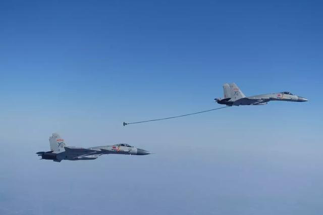 △渤海湾畔,北部战区海军航空兵某部正在开展舰载机空中加油训练。