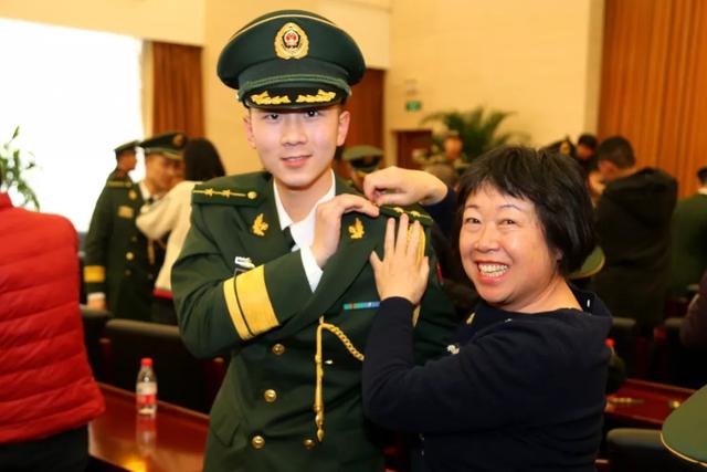 △1月,武警北京总队执勤第四支队举行干部士官晋升授予警衔仪式,一位母亲为儿子佩戴警衔。姜润邈摄