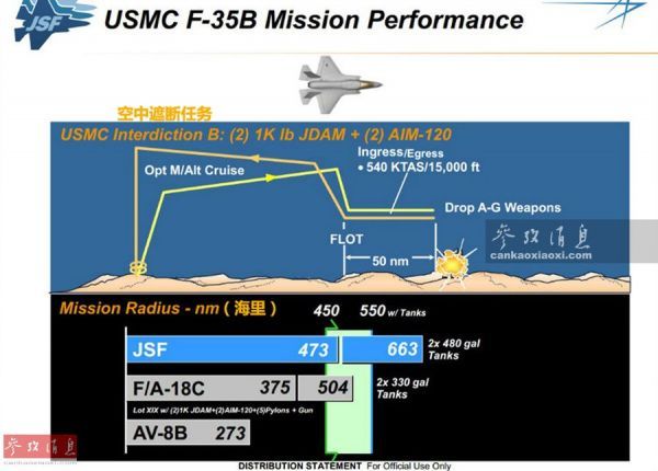 从洛马公司官方公开的F-35B作战性能看(如图所示),单架F-35B在执行空中遮断任务,携带2枚454千克级JDAM卫星制导炸弹和2枚AIM-120空空导弹(只使用内置弹舱)时,最大作战半径可达876千米,要远超采用同等载弹量的AV-8B和F-18C战机。