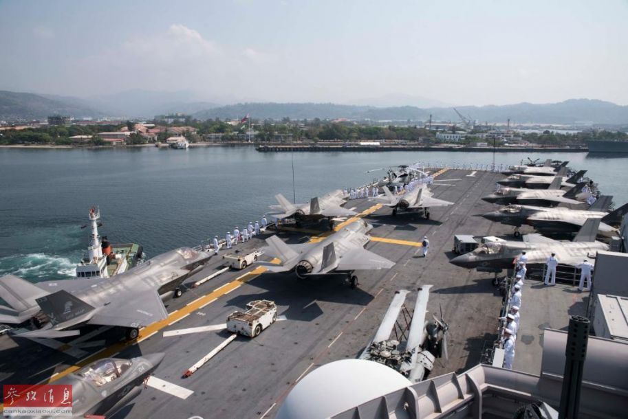 美海军官网近日放出高清组图显示,“黄蜂”号两栖攻击舰抵达菲律宾,参加“肩并肩”联合军演,其甲板上可见满载F-35B短垂隐身战机群。这是“黄蜂”号在装备F-35B后首次抵达菲律宾,西方军事家认为此次美菲军演,针对中国意味较为明显。图中“黄蜂”号甲板可见10架F-35B战机。