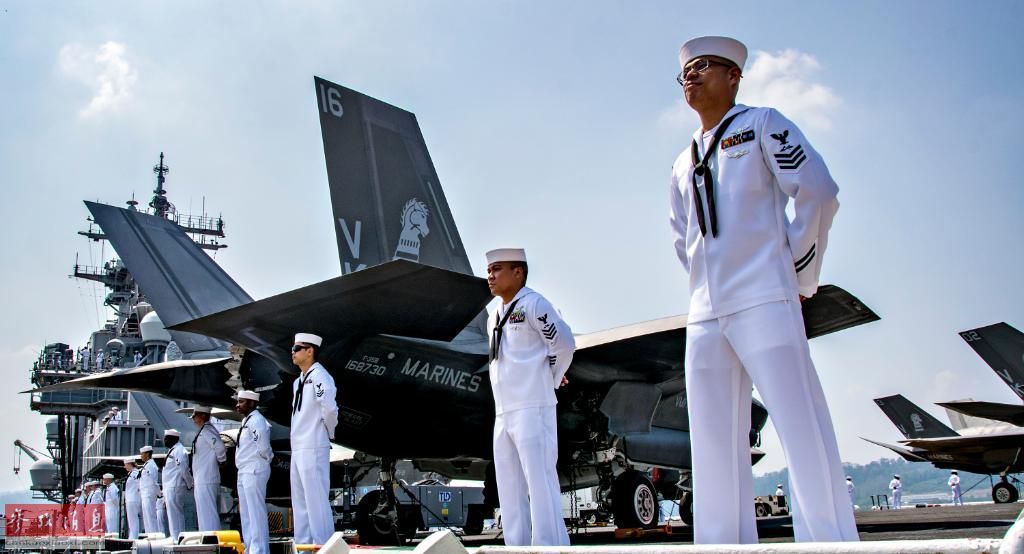 图为美海军水兵在“黄蜂”号甲板上进行列队站坡仪式,可见F-35B的垂尾上的VMFA-121“绿骑士”中队徽标。