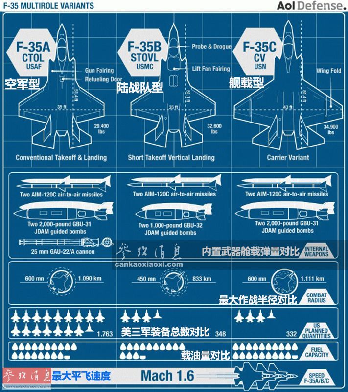 这张对比图详细列举了F-35系列三型号的作战性能,其中F-35A(空军型)是唯一配备固定航炮的型号,F-35B则是三型中唯一具备短垂起降能力的,而F-35C(海军舰载型)是三种型号中尺寸最大的,其作战半径也是三型中最大的,三种型号的最大平飞速度均为1.6马赫。