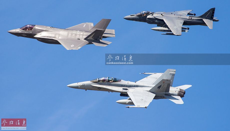 由于F-35B兼具隐身、短垂起降和超音速飞行能力于一身,按美海军陆战队计划,F-35B隐身战机将在未来替换现役的AV-8B短垂战机和FA-18CD舰载战机群,图为美陆战队的AV-8B、F-35B和FA-18D(双座型)编队飞行。