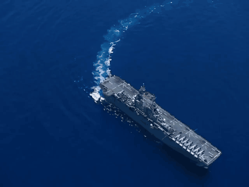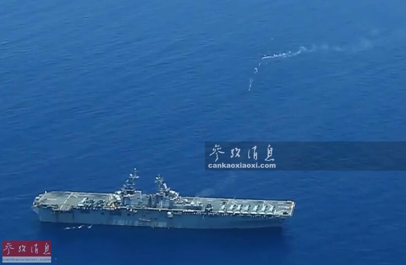 航拍视角可见海上靶标与“黄蜂”号两栖攻击舰的相对距离。