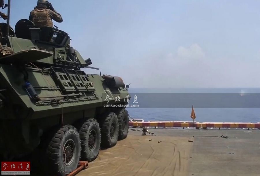 美军“黄蜂”号两栖攻击舰在南海航行期间,LAV-25轮式装甲车在甲板进行海上打靶动态图。