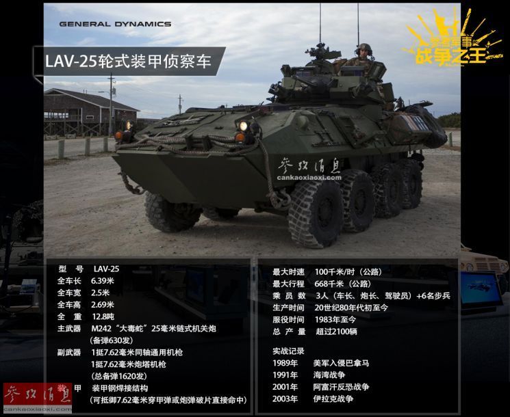 LAV-25轮式装甲车由美国通用动力公司研发,是美海军陆战队的标志性装备之一,因为该型战车自1983年服役以来,基本与美陆战队如影随形,具有较高的出镜率,例如参与了1989年,美军入侵巴拿马的作战行动;1991年海湾战争期间,美海军陆战队乘坐该型战车率先突入科威特境内。近年来在阿富汗及伊拉克的反恐战争中,LAV-25也有出色表现。