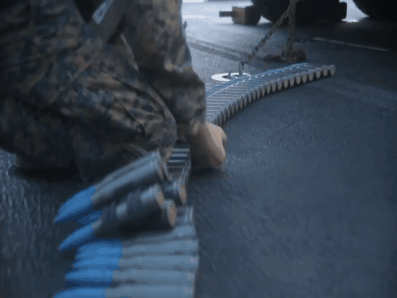 图为此次“黄蜂”号海上打靶期间,美陆战队员正在整理LAV-25所用的25毫米弹链。