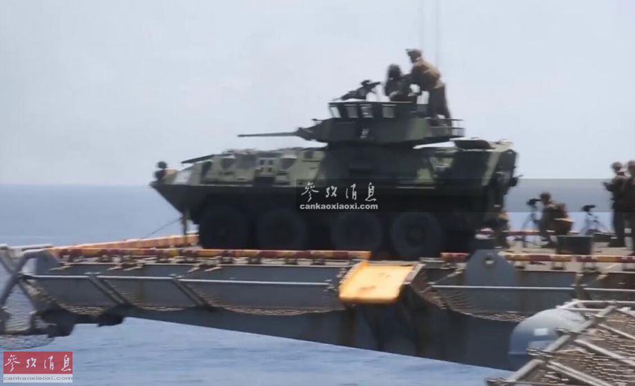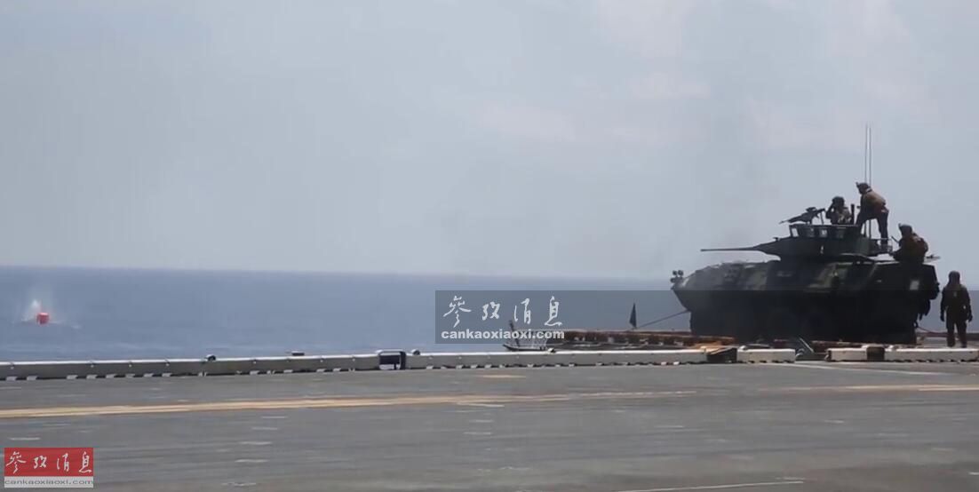 LAV-25装甲车在“黄蜂”号上海上打靶动态图。