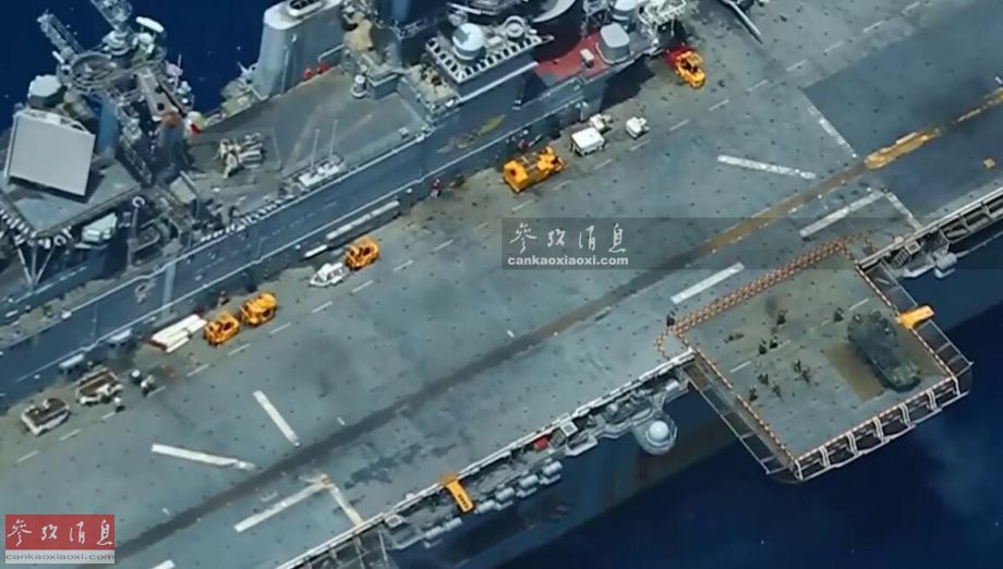 较远距离拍摄的固定在左舷侧升降机上进行打靶的LAV-25战车,这一位置不仅便于海上打靶,且利于直接借道机库返回车辆甲板。