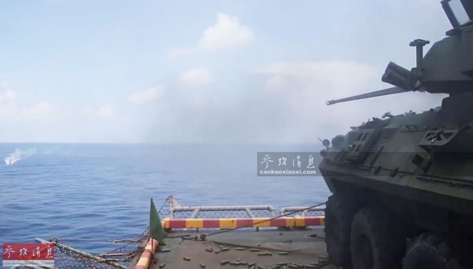 另一角度拍摄的LAV-25海上打靶瞬间,可见四散的弹壳。