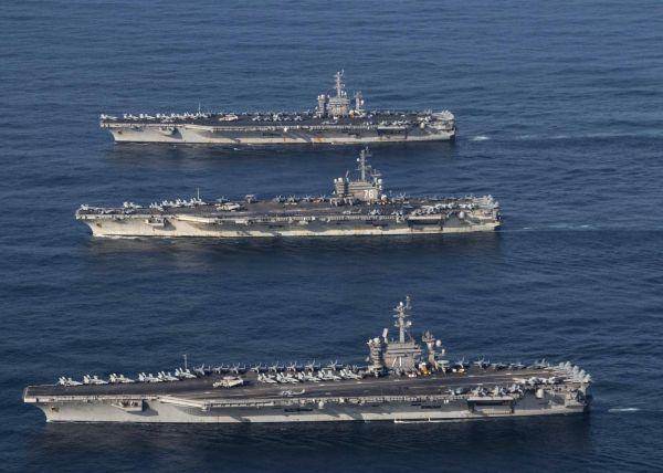 资料图片:美海军3艘尼米兹级核动力航母编队航行。(美海军官网)