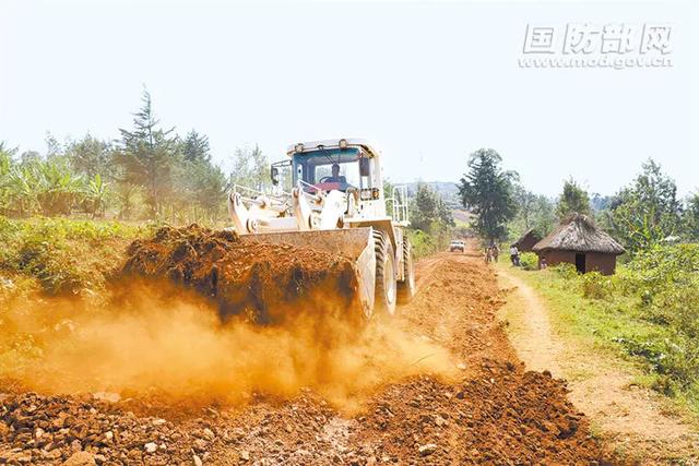 中国第22批赴刚果(金)维和部队官兵帮助当地居民修路。