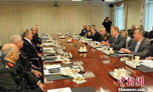 资料图片:2019年2月22日,美国国防部代理部长沙纳汉和土耳其国防部长阿卡尔在五角大楼举行会晤,双方重申两国防务关系,并讨论了在叙利亚打击“伊斯兰国”(ISIS)等问题。中新社记者 陈孟统 摄