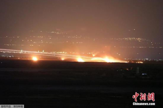 资料图片:叙利亚东南部库奈特拉遭空袭,火光四射似激光扫射。