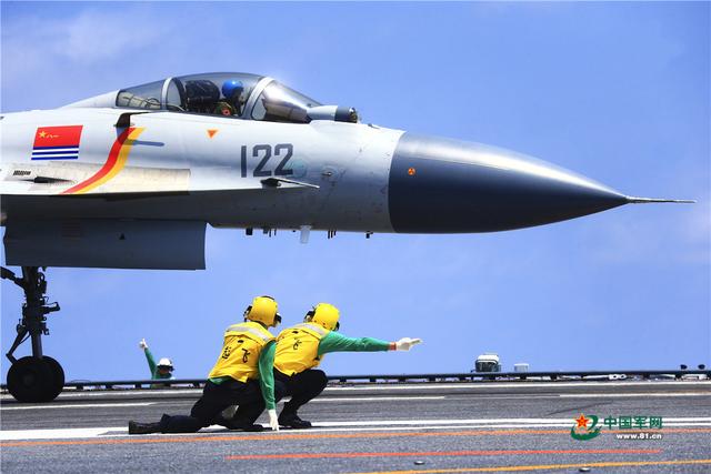 《国之重器》(组照之十四)歼-15舰载机飞行员示意起飞。
