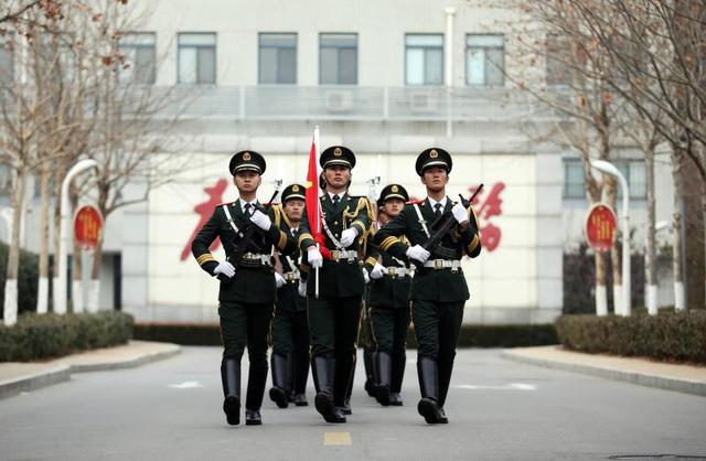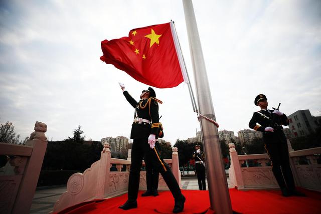 在雄壮的《国歌》声中,升旗手迎风振臂,五星红旗在官兵的注目下冉冉升起。
