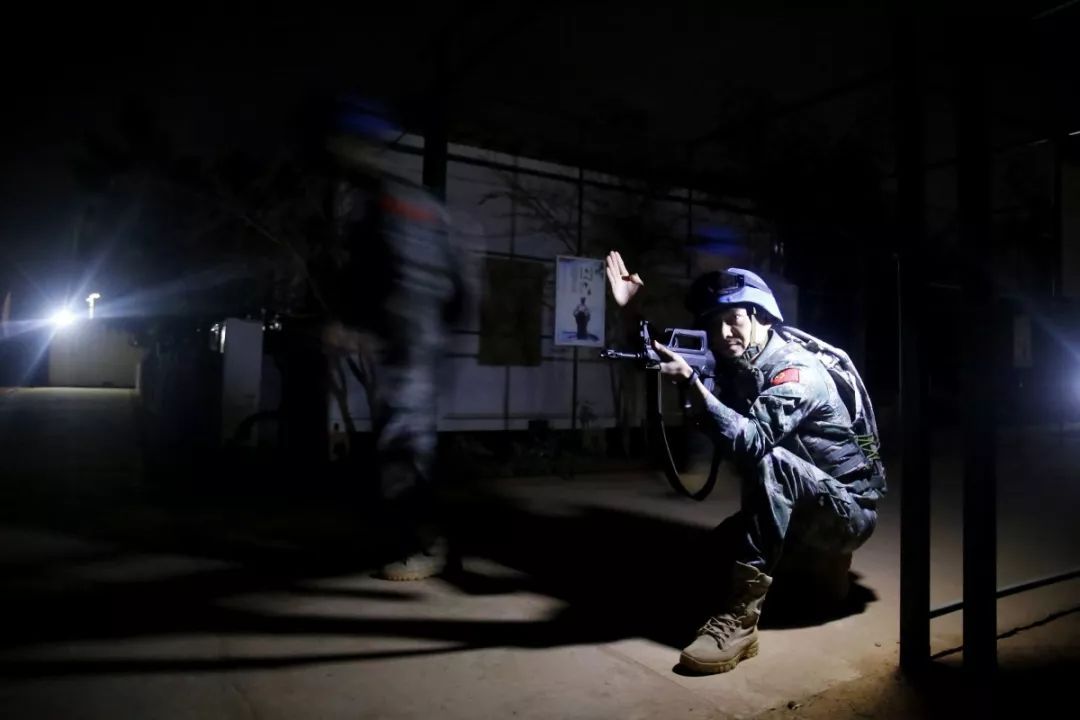 天未破晓,警报骤然响起,维和官兵们迅速穿戴装具,全副武装奔向各自的战位。步兵班班长刘学和战友们交替掩护,冲上加奥超级营区的西侧阻绝墙,布置起守卫营区的第一线防御。