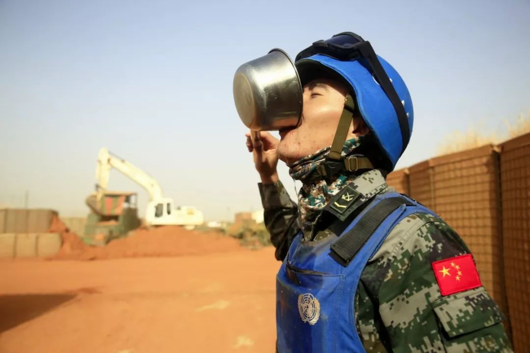 在马里,每天限时限量提供的洗漱用水格外宝贵。打扫完卫生整理过内务后,刘学抓紧时间到水房洗漱,感受这份难得的清凉。稍事休息,刘学又和战友一同外出,进行维和工程保障任务。