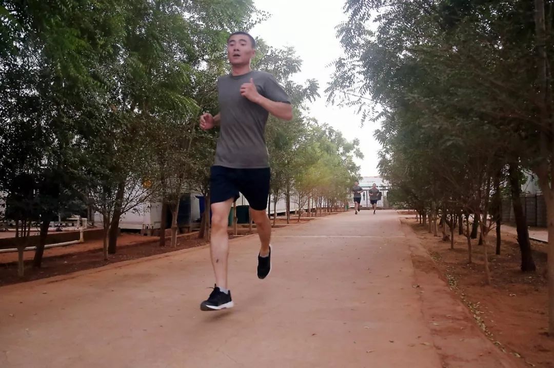 在整个加奥超级营区,唯有中国维和营区拥有平整的水泥路面。结束了一天的任务后,刘学喜欢和战友一起慢跑几公里,最后再冲刺一圈。
