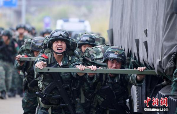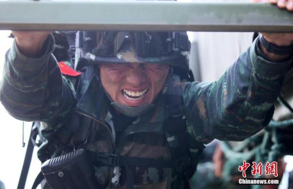 11月7日,“魔鬼周”极限训练进入第六天,武警福建省总队第二片区设置了10多项综合体能课目,在拓展官兵体能极限的同时,锻炼官兵在极端条件下排除万难、争取胜利、团结协作的能力。图为小组推车考验特战官兵团结协作能力。龙涛 摄