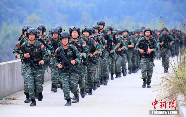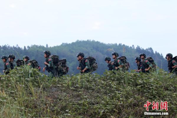 清晨,正在闽北某山林地宿营的特战官兵们,接到通报后迅速集合,经过1个多小时的艰苦跋涉,最终赶到指定地点。图为组织特战官兵20公里武装奔袭。龙涛 摄