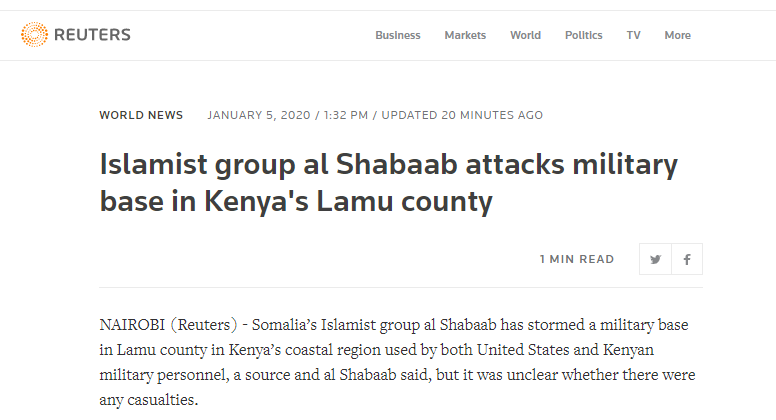 有军事消息人士告诉路透社说:“他们袭击了拉穆的紧邻军事营地的曼达机场跑道,那里(军事营地)有来自包括肯尼亚和美国的许多国家的军事人员。我们了解到,战斗仍在继续。”