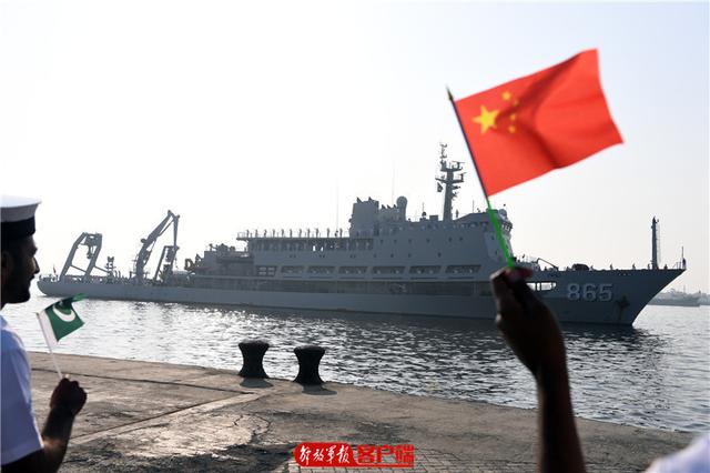 当地时间1月4日,巴基斯坦海军官兵在卡拉奇港口欢迎中国军舰到港。图为我海军援潜救生船刘公岛船(舷号865)靠港。(穆瑞林 摄)