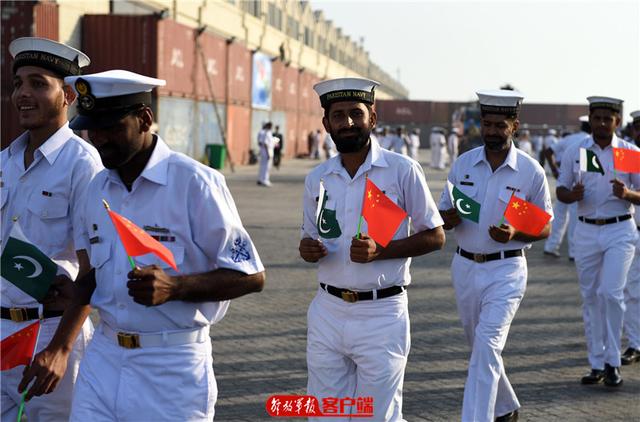 当地时间1月4日,巴基斯坦海军官兵在卡拉奇港口欢迎中国军舰到港。(穆瑞林 摄)