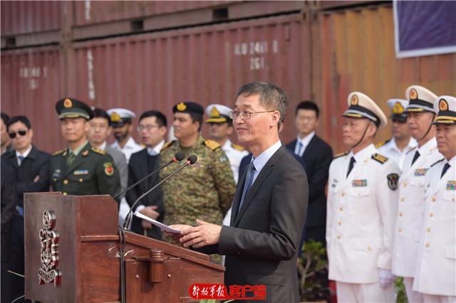 当地时间1月5日上午,演习中方指挥员、南部战区海军副参谋长黄凤志少将在巴方举行的欢迎仪式上致辞。(董兆辉 摄)