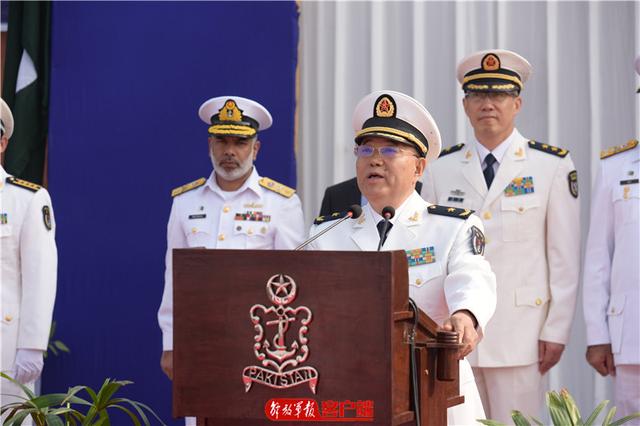当地时间1月5日上午,巴方在码头为到访的中国海军舰艇编队举行了隆重欢迎仪式。图为巴海军战术学校校长扎法尔·伊克巴尔准将在致辞。(董兆辉 摄)