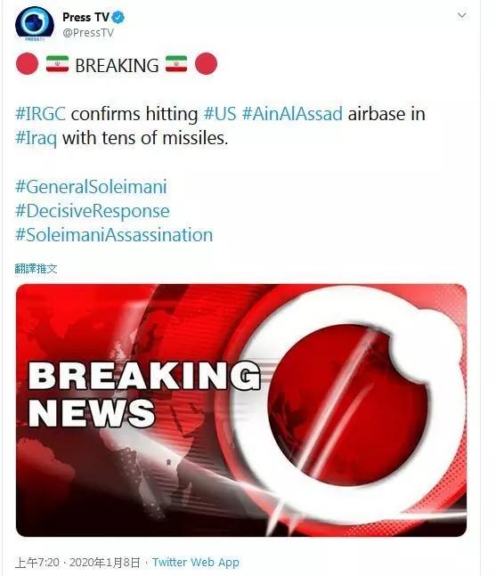 伊朗“Press TV”7日消息说,伊朗伊斯兰革命卫队证实以数十枚导弹袭击美国在伊拉克的Ain-Assad空军基地。(来源:环球网)