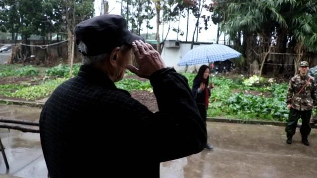 “您是我们的榜样!没有你们的奉献,就没有我们的今天!”临走前,官兵们向老人表达崇高敬意。屋外飘着冷雨,老人站在雨中向官兵敬礼告别,抬起的手迟迟不肯放下……