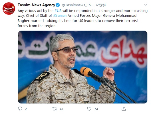 【环球网快讯】美军驻伊拉克的阿萨德空军基地8日遭到“火箭弹”袭击后,伊朗塔斯尼姆通讯社透露,伊朗武装力量总参谋长巴盖里就此强硬表态并警告美国说,对于他们的任何恶意行为,伊朗都将以更强大且更强硬的方式回击。报道称,巴盖里还“提醒”说,现在是美国领导人将他们的“恐怖分子”从该地区撤离的时候了。
