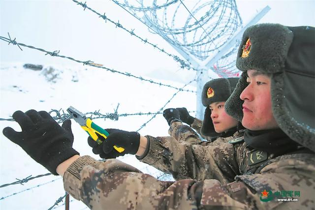 巡逻途中,官兵维修铁丝网。