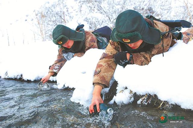 官兵从冰河里取水饮用。