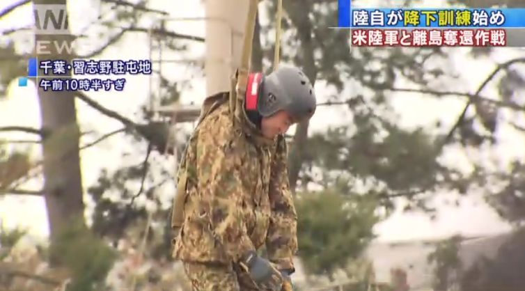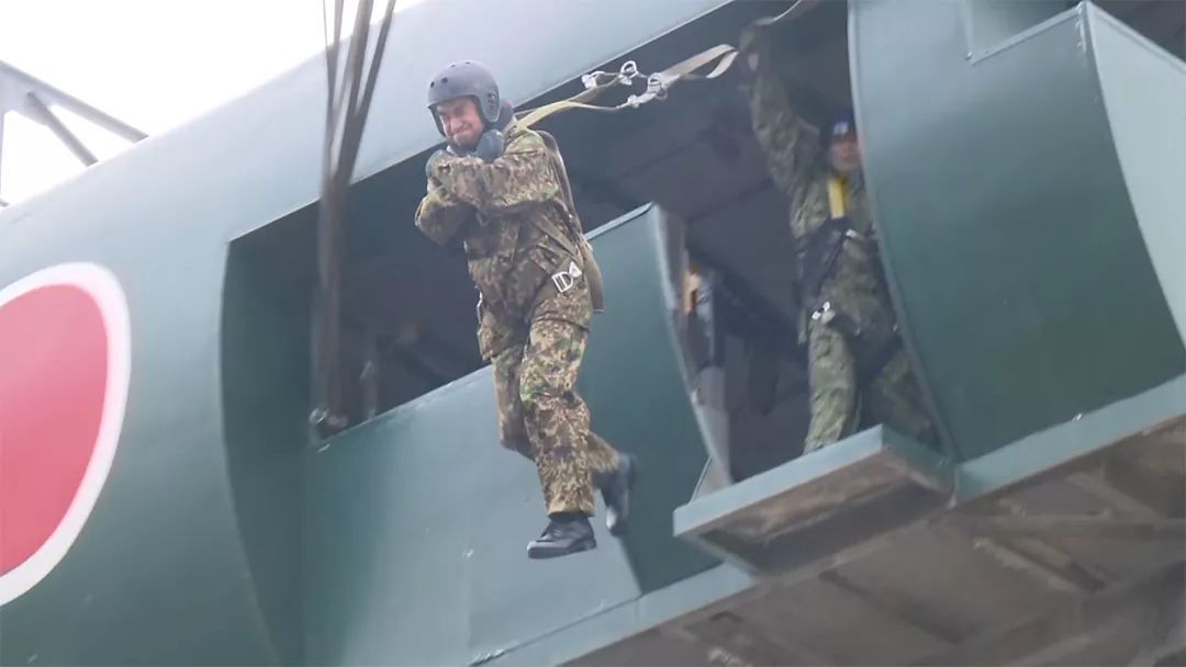 日本FNN新闻网报道,1月12日上午,日本陆上自卫队伞兵部队在习志野驻屯地举行新年例行的“跳伞训练开训”。期间防卫大臣河野太郎参加模拟跳伞,从高达11米伞塔上大喊着“河野太郎,加油”,纵身跳下。