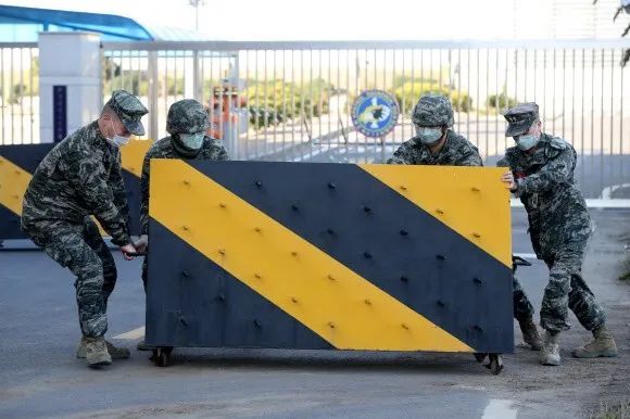 韩国某部队正门前,官兵们设置路障防疫(韩联社)