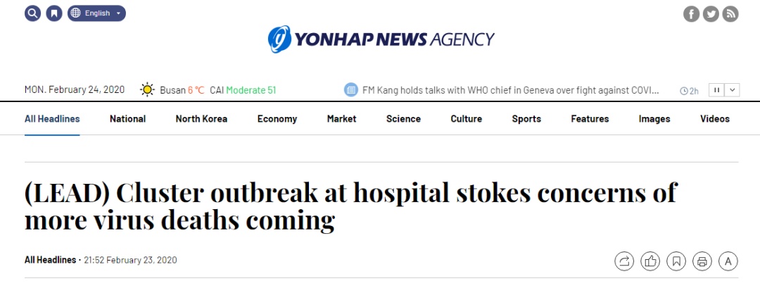 据韩联社报道,继韩国大邱市新天地教会后,清道郡一家医院也出现了疫情爆发,102名病人、9名医护人员被确诊感染了新冠肺炎。