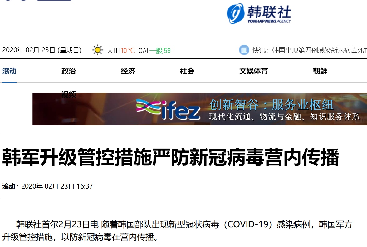 报道称,截至当地时间23日上午9时,韩国新增123例确诊病例,累计确诊增至556例,有担忧韩军部队内部或已存在没有确诊的感染者。为防止疫情扩散,韩国国防部22日起限制官兵休假、外出、外宿和探视。截至22日下午4时,军方隔离1300余人,各军根据国防部的方针加强了管控措施。陆军、海军、空军、海军陆战队从本月10日起针对前往大邱、庆北地区休假或外出的官兵进行全面调查。