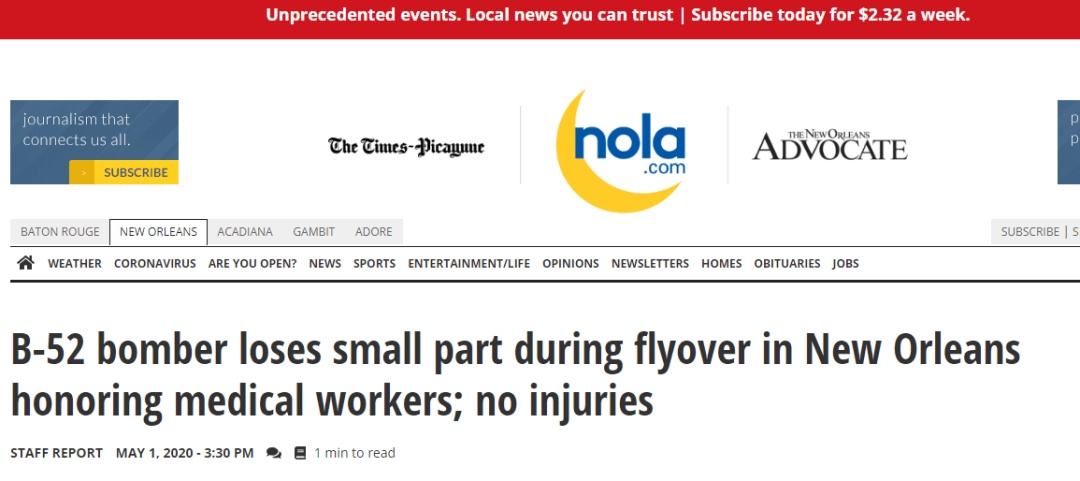 当地时间5月1日,美国空军在路易斯安那州新奥尔良市上空举行了一次飞越活动,向当地抗击新冠肺炎疫情的医护人员致敬。然而,意想不到的一幕却发生了:活动期间,一架B-52轰炸机舱门上的一块零件从机身脱落......