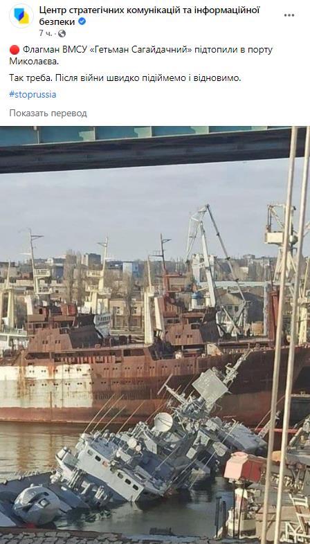 乌战略通信和信息安全中心通过其社交媒体脸书账号上发文称,“乌克兰海军旗舰‘格特曼·萨盖达奇内’号在尼古拉耶夫港已部分淹没,这是必要的。战后乌克兰当局将‘迅速打捞和修复’这艘军舰。”该中心还发布了一张“格特曼·萨盖达奇内”号护卫舰在港口泊位附近的图片,显示其一部分已经沉没在水下。