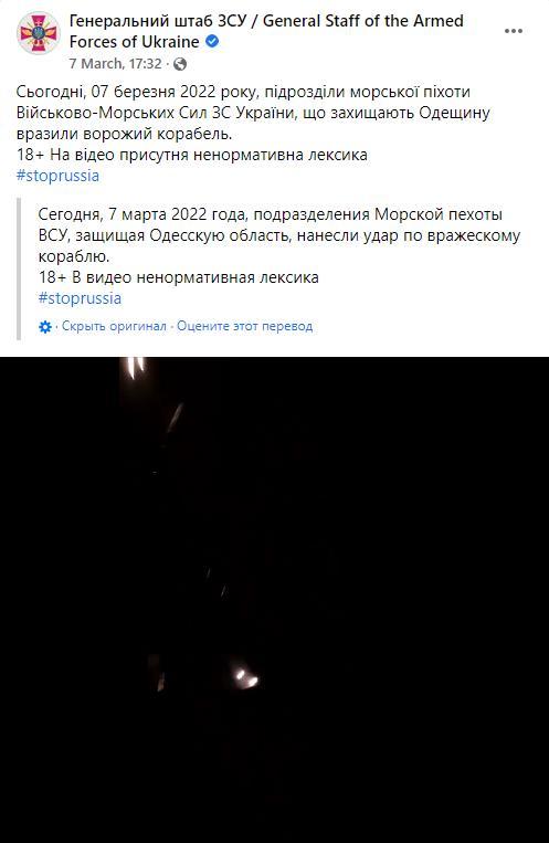 乌克兰武装部队总参谋部在社交媒体脸书上也分享了这段视频,并写道:“今天,2022年3月7日,保护敖德萨地区的乌克兰武装部队海军陆战队队员击中了一艘敌舰。”