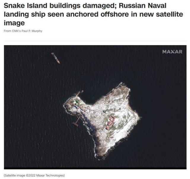 CNN指出,从卫星图片中可以看到,蛇岛中心的一些红顶建筑因俄军炮击而遭到严重破坏,Maxar Technologies公司辨认出停泊在该岛附近的那艘俄罗斯军舰是一艘“蟾蜍”级登陆舰。虽然部分地区被白雪覆盖,但岛上的一些地方可以看出有弹坑。