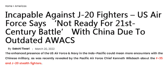 多家西方媒体还注意到,就在称赞歼-20和空警-500的同时,威尔斯巴赫却在感叹美国空军装备的E-3预警机严重老化,“它们配备的传感器在21世纪的空战中无法发挥真正的能力,尤其是对抗歼-20或类似的隐形平台。E-3对这些目标的探测距离不够,导致己方战斗机无法获得优势。”