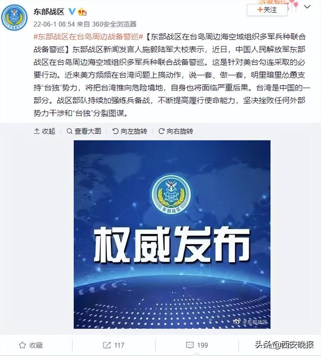 东部战区新闻发言人施毅陆军大校表示,近日,中国人民解放军东部战区在台岛周边海空域组织多军兵种联合战备警巡。这是针对美台勾连采取的必要行动。近来美方频频在台湾问题上搞动作,说一套、做一套,明里暗里怂恿支持“台独”势力,将把台湾推向危险境地,自身也将面临严重后果。台湾是中国的一部分。战区部队持续加强练兵备战,不断提高履行使命能力,坚决挫败任何外部势力干涉和“台独”分裂图谋。(“东部战区”微博)
